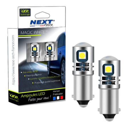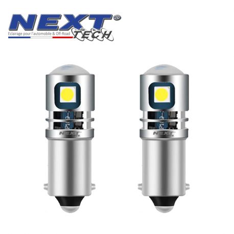Paire d'ampoules H6W BAX9S Next-Tech® dotées de 5 LED blaches afin d'obtenir un éclairage unifrome. Le système anti-erreur de ces ampoules LED H6W BAX9S est comaptible avec les véhicules 12 volts et 24 volts.